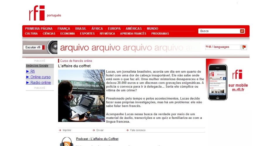 RFI (www.rfi.fr/actubr/pages/001/page_43.asp)- Áudios de histórias em séries servem para o estudo de francês. O site também envia um boletim eletrônico diário com as notícias mundiais, para ser baixado para o computador e ser ouvido. Há exercícios e explicações para uma nova palavra citada no noticiário Leia mais Reprodução